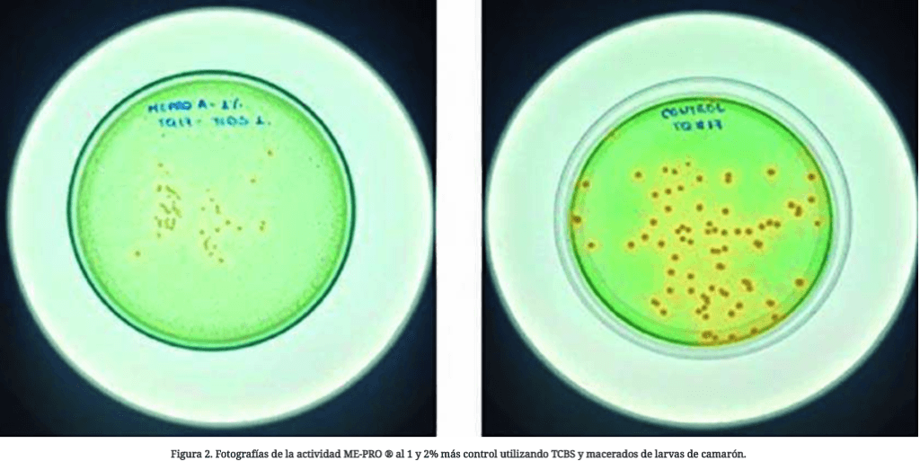 Además, se cultivó una cepa de V. parahaemolyticus (VP AHPND) en medio TSB líquido con la inclusión de ME-PRO ® al 1 y 2%.