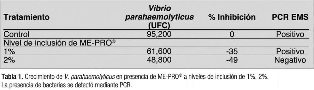 “Los resultados de los recuentos de UFC bacterianas determinaron que un nivel de inclusión del 2% de ME-PRO ® inhibe el crecimiento de la carga de V. parahaemolyticus hasta en un 50%, lo que también resulta en una PCR negativa para la toxina AP4 (ver Tabla 1)”.