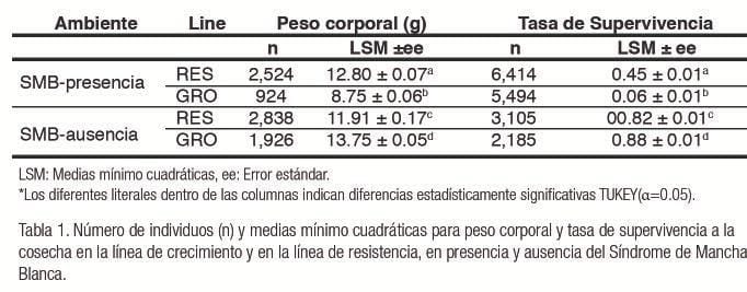 Los resultados muestran diferencias en SC, donde la línea CRE tiene una baja SC en SMB-presencia; mientras que los camarones de la línea RES poseen una menor SC en SMB presencia. Las interacciones de línea por ambiente resaltan la importancia de considerar la probabilidad de ocurrencia de la enfermedad SMB, cuando se elige la línea en el Programa de Mejoramiento Genético (Tabla 1).