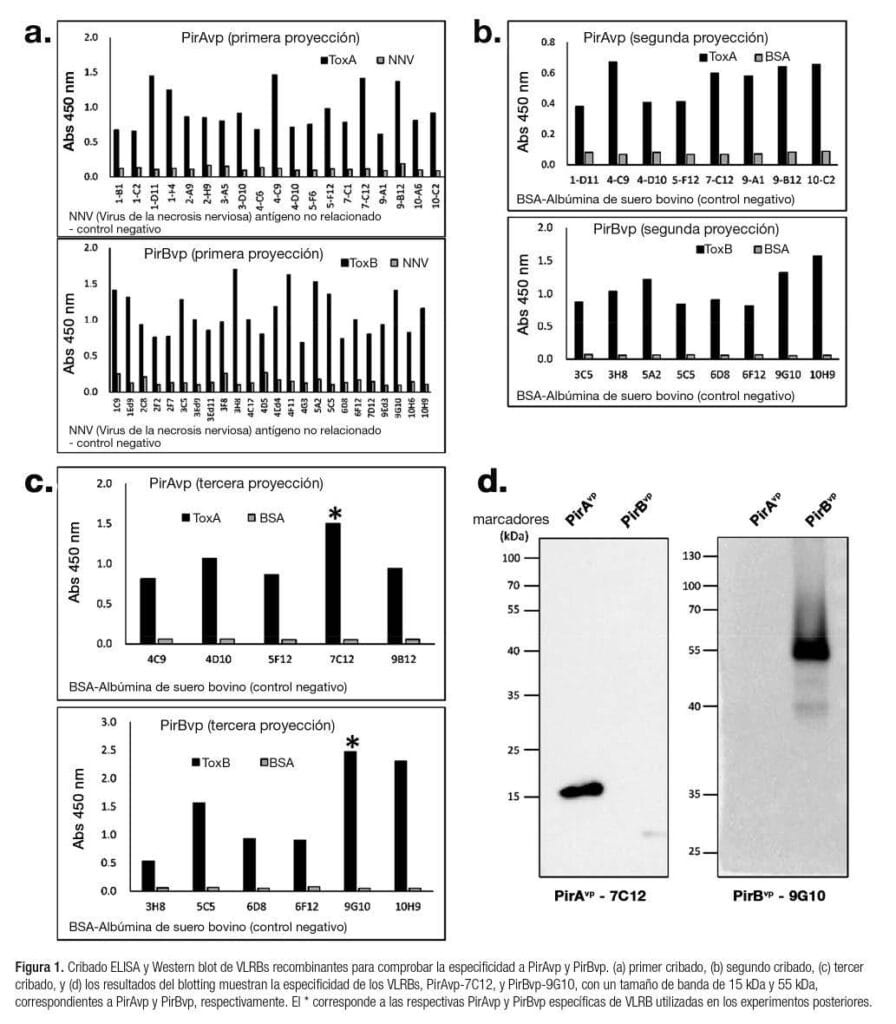 El ELISA se realizó tres veces para asegurar la especificidad de los VLRBs propios de PirAvp o PirBvp, siendo PirAvp-7C12 y PirBvp-9G10 los que mostraron los niveles más altos de especificidad, los cuales se aprovecharon posteriormente para otros experimentos. Establecimiento de una línea celular que secreta VLRBs recombinantes anti-PirAvp/ PirBvp Se recogieron las células que secretan los VLRBs recombinantes específicos de PirAvp/PirBvp, PirAvp-7C12 y PirBvp-9G10. Una vez establecida la especificidad, se prepararon los sobrenadantes a gran escala y se denominaron como anticuerpos PirAvp-7C12 y PirBvp-9G10.