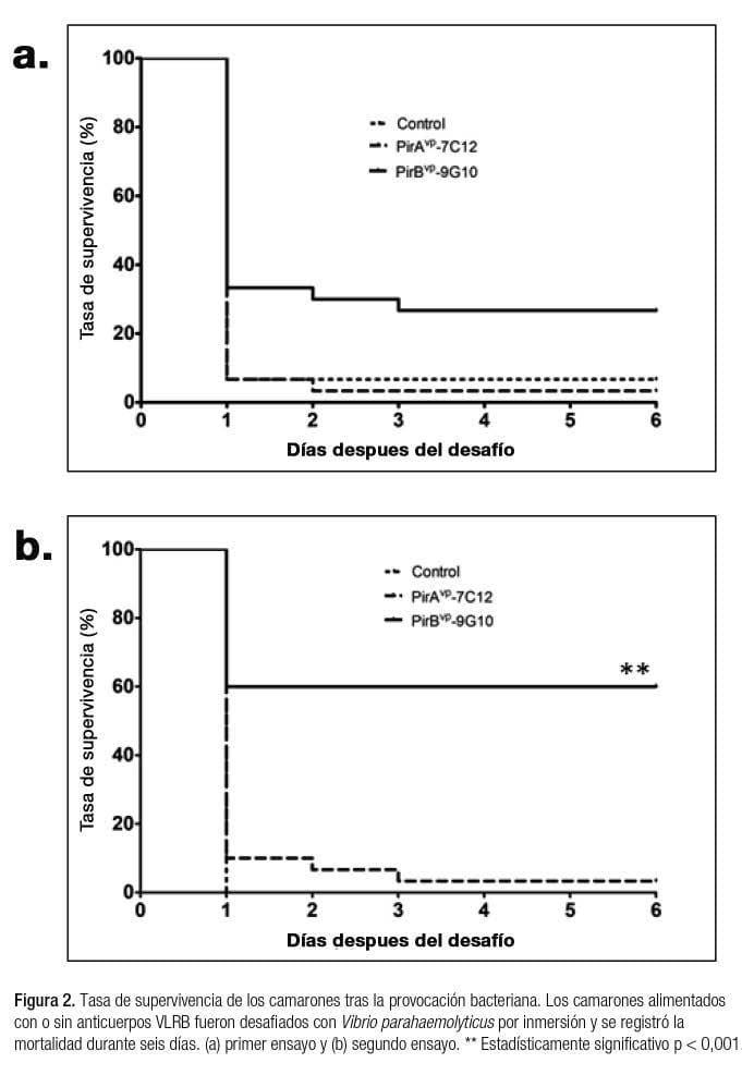 Según los resultados obtenidos, el nivel de supervivencia en el primer ensayo experimental en el que los camarones se alimentaron con el anticuerpo PirBvp-9G10 fue del 26,7%, lo que fue significativamente mayor que en el grupo alimentado con el anticuerpo PirAvp-7C12 (3%) y el control negativo (6%). En el ensayo de repetición, los resultados fueron aún más marcados, el grupo alimentado con el anticuerpo PirBvp-9G10 mostró una supervivencia del 60%, en contraste con el grupo alimentado con PirAvp-7C12 o el grupo de control negativo, que evidenciaron un 3% y un 0% de supervivencia, respectivamente.