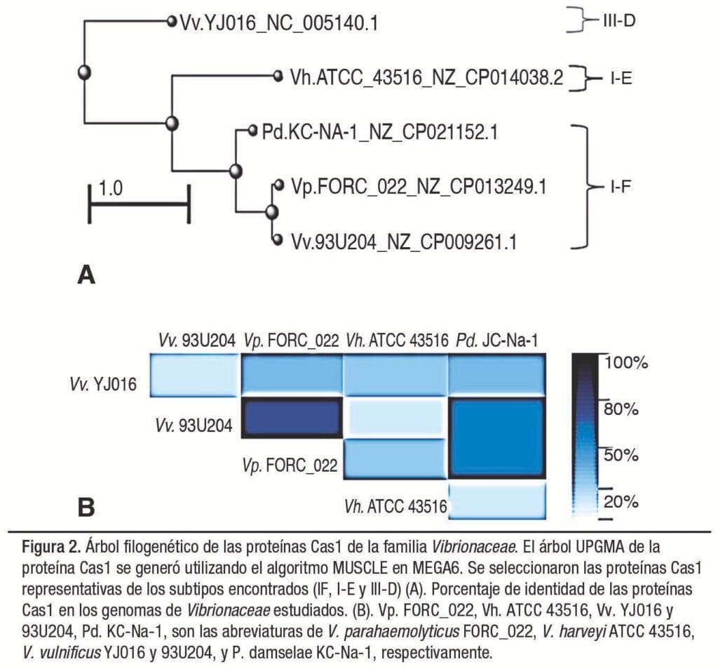 Para distinguir mejor el sistema CRISPR/Cas en el género Vibrio, o en los miembros con matrices CRISPR encontradas en la familia Vibrionaceae, se construyó un árbol filogenético basado en la homología de las proteínas Cas1 de cada especie (Figura 2). También, se evaluó la distinción entre el tipo de CRISPR encontrado por el análisis de secuencia de repetición directa (DR). Se encontró que las DR estaban interespaciadas, con un mínimo de 3 a un máximo de 55 secuencias espaciadoras de una longitud similar entre 31 y 43 pb.