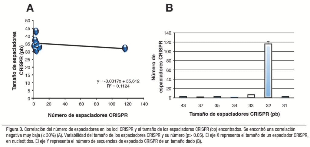 Sin embargo, existe una correlación muy baja entre el número y el tamaño que presentan estas secuencias (Figura 3). El número total de espaciadores detectados por tipo de CRISPR fue 96/142 para los tipos I-F (68%), 37/142 para el tipo I-E (26%) y 9/142 para el tipo III-D (6%). Las estructuras CRISPR observadas exhibieron entre 6 y 8 genes asociados con las secuencias CRISPR (Cas).