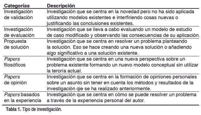 A tal efecto, se establecieron en seis categorías, a saber: investigación de validación, investigación de evaluación, propuesta de solución, artículos filosóficos, artículos de opinión y artículos basados en la experiencia (Tabla 1).