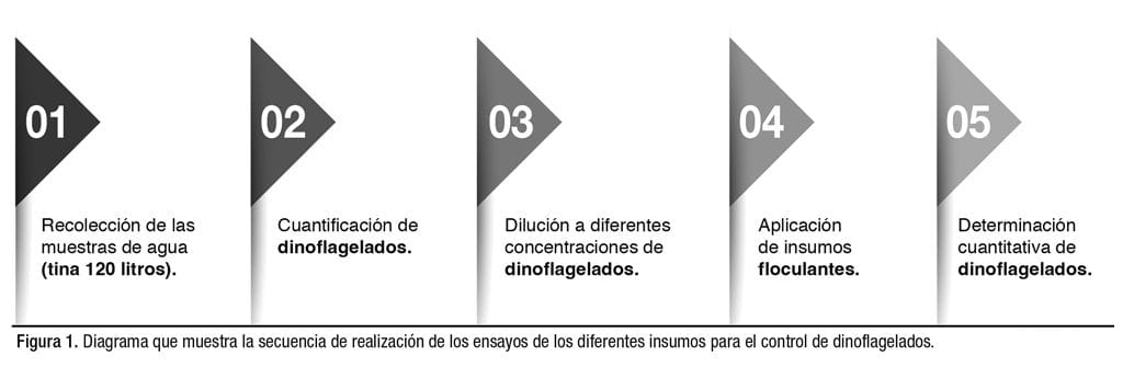 En la Figura 1, se muestra el diagrama de la secuencia de ejecución de los ensayos de los diferentes insumos para el control de dinoflagelados.