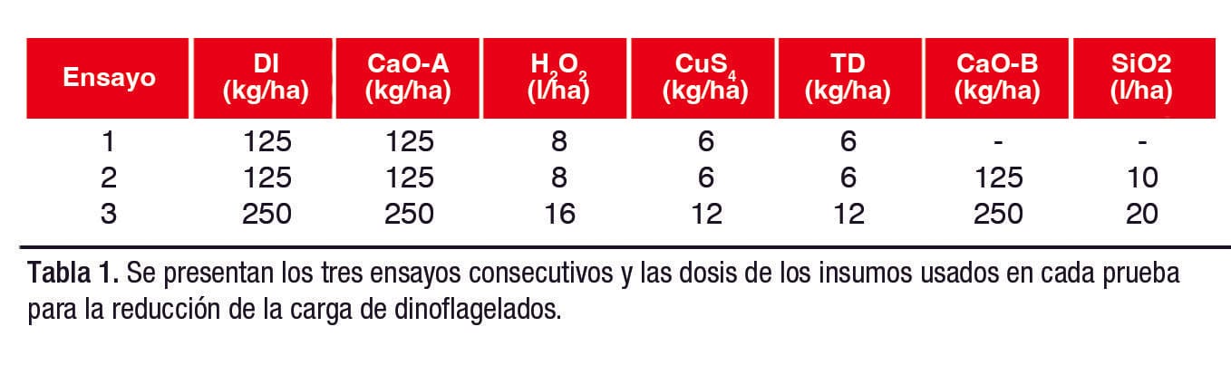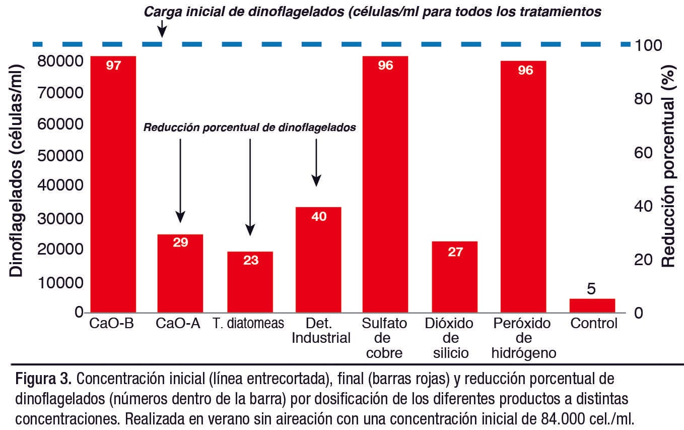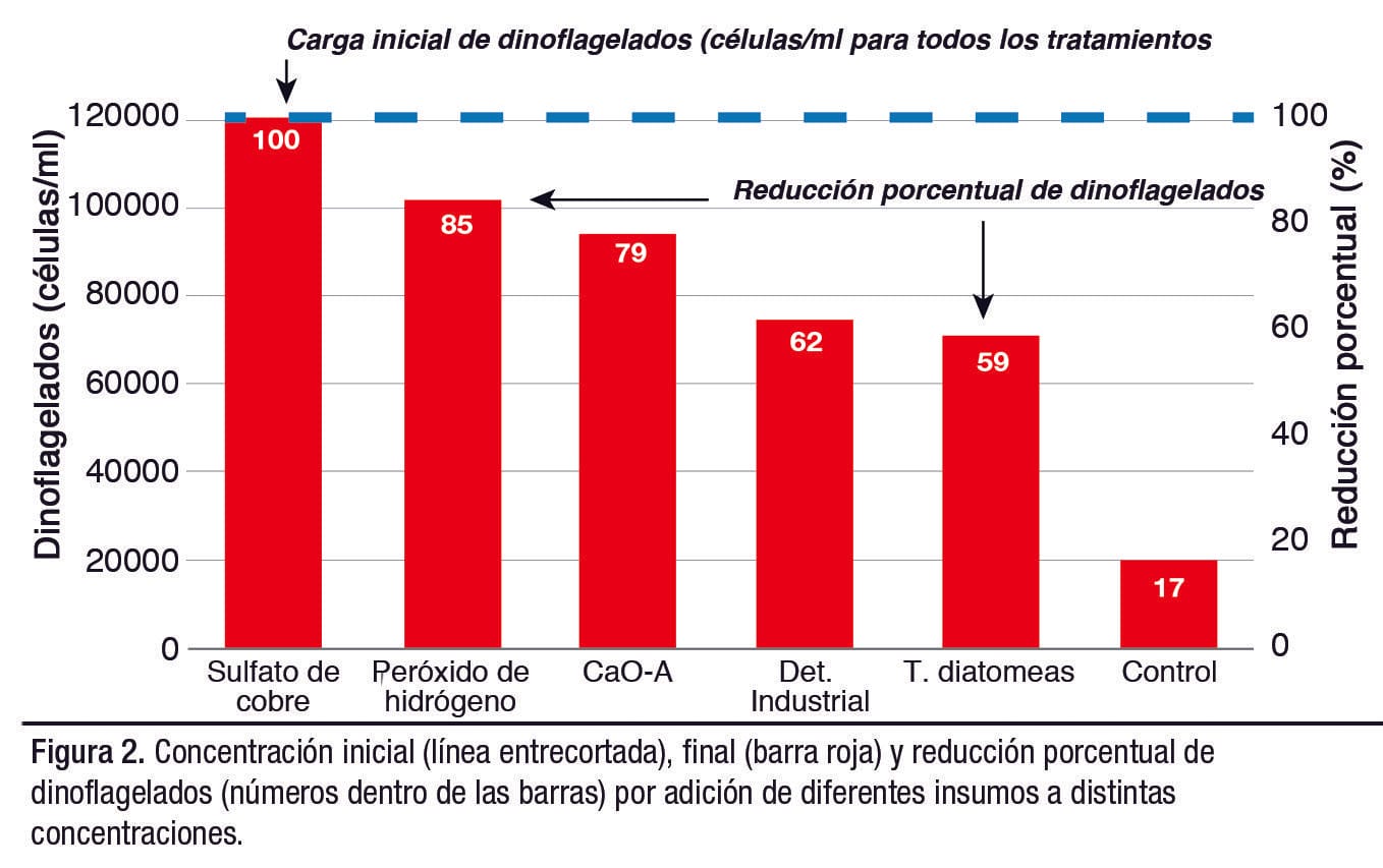 Con el uso de peróxido de hidrógeno (H2O2) a razón de 16 l/ha se alcanzó una reducción de 52%. Adicionalmente, 250 kg/ha cal viva (CaO-A) bajó la carga en un 48%, mientras que 2 kg/ha de detergente industrial logró eliminar el 21%. Finalmente, 20 kg/ha dióxido de silicio (SiO2) redujo el 4% de dinoflagelados.