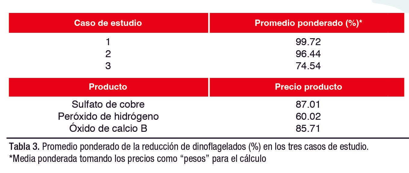 Las reducciones de dinoflagelados no son necesariamente proporcionales a las dosis de los insumos usados. Al ponderar los promedios de los tres casos de estudio para los tres insumos evaluados, se confirma que los dos tratamientos con mayor eficiencia para reducir la población de dinoflagelados son el sulfato de cobre y óxido de calcio B (Tabla 3).