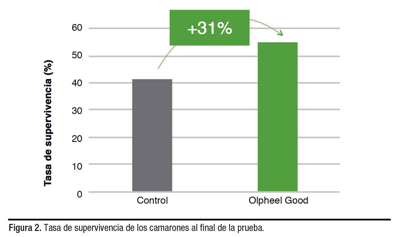 En cuanto a la supervivencia al final de la prueba, la inclusión de Olpheel Good mejoró esta tasa, que alcanzó el 55% frente al 42% del grupo de control (Figura 2), sugiriendo que Olpheel Good le permitió comer y tener la energía necesaria para su supervivencia a una cantidad mayor de camarones.