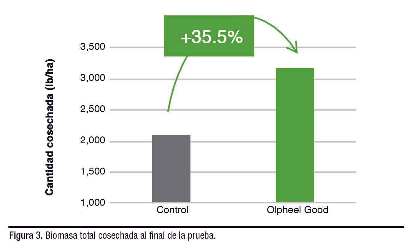 Considerando el mejoramiento de ambos parámetros mencionados (mayor supervivencia y ganancia de peso individual), la inclusión de Olpheel Good condujo a un importante aumento de la biomasa (Figura 3) con 3,189 lb de camarones cosechados en comparación con 2,089 en el grupo de control (+35.5%).