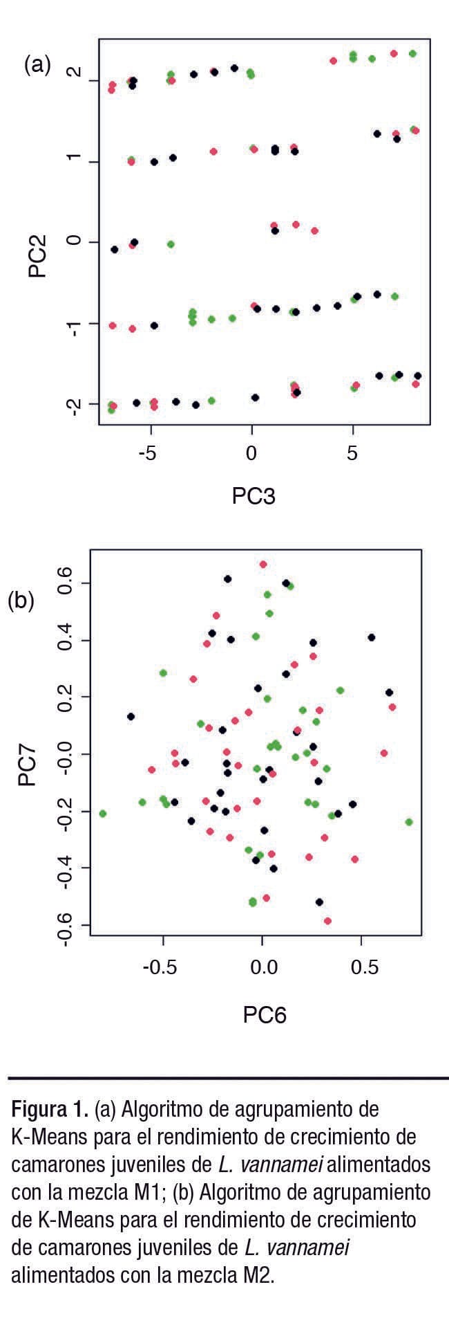 En el gráfico (a) se observan diferencias importantes. El Grupo 1 (color azul) indica la presencia de 25 camarones juveniles L. vannamei alimentados con la mezcla M1 con mayor relación de eficiencia alimenticia y ganancia de peso, mientras que el Grupo 2 (color verde) indica la presencia de 40 camarones juveniles L vannamei alimentados con la mezcla M1 con mayor relación para tasa de crecimiento específico e índice de eficiencia proteica y el Grupo 3 (color rojo) indica la presencia de 25 juveniles L. vannamei alimentados con la mezcla M1 con mayor relación de supervivencia específica.