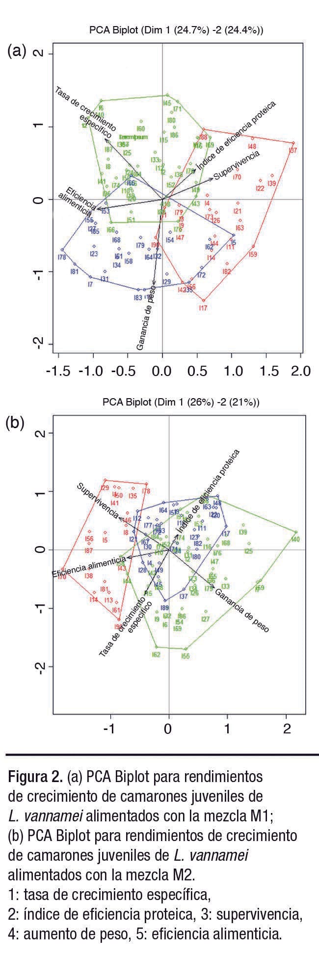 Las herramientas de minería de datos como PCA Biplot y el algoritmo K-means mostraron que los camarones juveniles Litopenaeus vannamei alimentados con la mezcla M2 presentaron la relación más alta con tasa de crecimiento específico, ganancia de peso, relación de eficiencia de proteína, proteína bruta y lípido bruto.