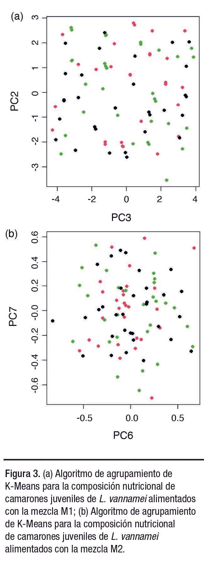 Mientras, que en el gráfico (b): el tamaño del Grupo 1 (color negro) es 30, el tamaño del Grupo 2 (color verde) es 28, y el tamaño del Grupo 3 (color rojo) es 32. Los camarones juveniles L vannamei alimentados con la mezcla M2 pertenecientes al Grupo 3 presentaron los valores más altos de parámetros nutricionales.