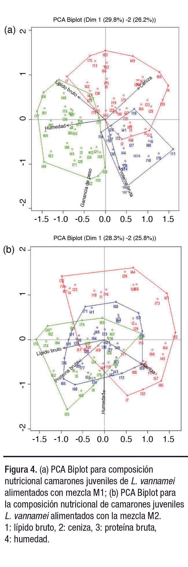 Se observaron en el gráfico (a) diferencias importantes entre los agrupamientos. El Grupo 1 (color verde) indica la presencia de 35 camarones juveniles L. vannamei alimentados con la mezcla M1 con mayor relación de humedad y lípido bruto, mientras que el Grupo 2 (color rojo) indica la presencia de 36 camarones juveniles L. vannamei alimentados con mezcla M1 con mayor relación para cenizas y el Grupo 3 (color azul) indica la presencia de 19 camarones juveniles L. vannamei alimentados con mezcla M1 con mayor relación para la proteína bruta.