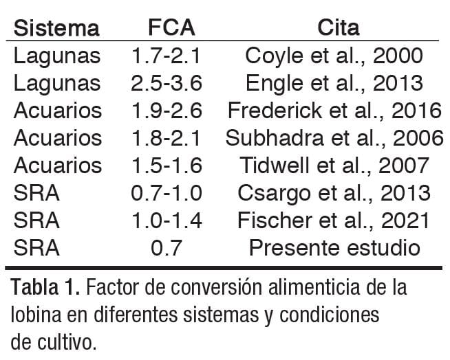 Además, la información bibliografía muestra que, en diferentes condiciones y sistemas de cultivo, la lobina en engorda presenta valores de 0.7 a 3 de FCA.