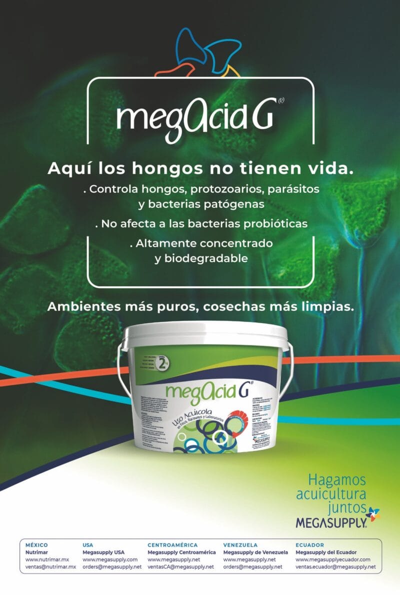 La empresa Megasupply desarrolló MegAcidG®, un innovador aditivo para alimento y agua formado por una combinación de ácidos orgánicos y alicina, que reduce la proliferación de microrganismos patógenos, controlando hongos, protozoarios, parásitos y bacterias patógenas en el tracto digestivo de camarones y peces, así como en el agua de cría.
