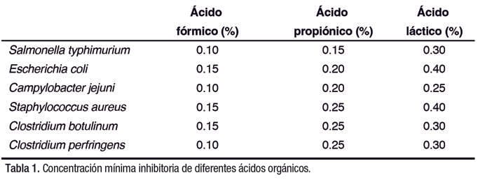 Cada ácido orgánico tiene su propio espectro de actividad antimicrobiana. En la Tabla 1, se muestran los valores de concentración mínima inhibitoria de algunos ácidos orgánicos en su actividad contra bacterias gram negativas y gram positivas, determinados en condiciones in vitro debido a sus propiedades físicas y químicas específicas.