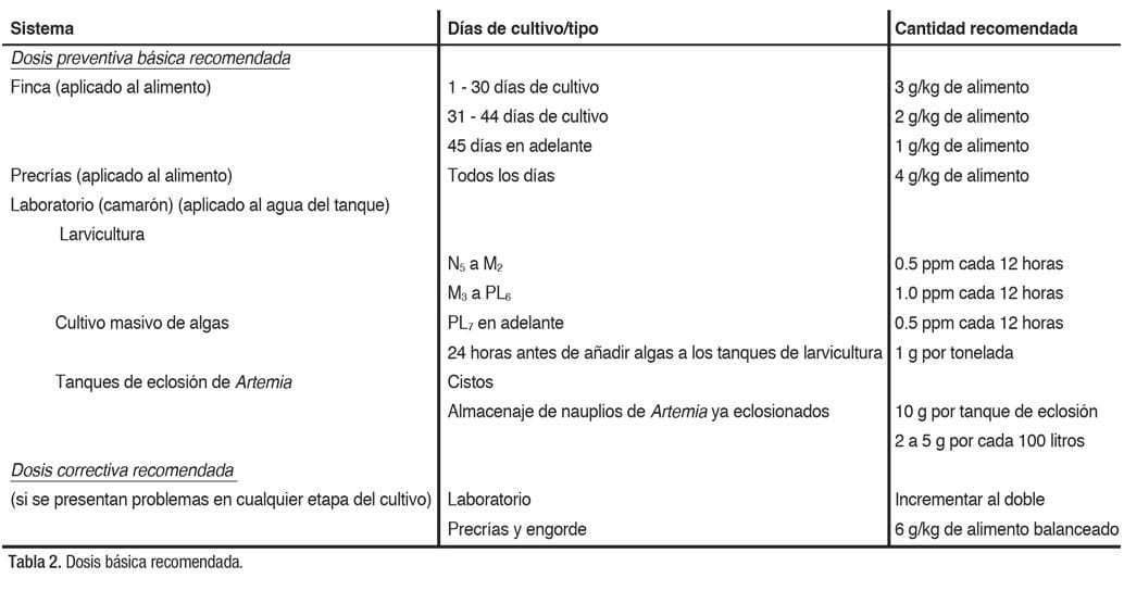 En caso de que se presente un evento de alta mortalidad en cualquier etapa del cultivo, se recomienda aumentar la dosis a 6 gramos/kilogramo de alimento balanceado. Para la aplicación en el agua, se calcula la cantidad necesaria de MegAcidG® (Tabla 2) y se mezcla vigorosamente con agua limpia, añadiéndola luego al tanque de cultivo.