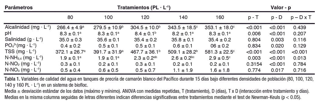 “Los sólidos suspendidos totales (SST) fueron significativamente diferentes entre tratamientos, días y la interacción entre estos factores. Los tratamientos presentaron variación en función de la densidad de población de forma que el aumento de la densidad se correlacionó con el aumento de SST en el agua (Tabla 1).”