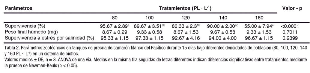 La supervivencia fue mayor en los tanques con menor densidad de población, pero no se observaron diferencias significativas entre los tratamientos con 100 y 140 PL · L-1. En los tanques con mayor densidad de población, por ejemplo, 160 PL · L-1, la tasa de supervivencia del camarón fue menor (Tabla 2).