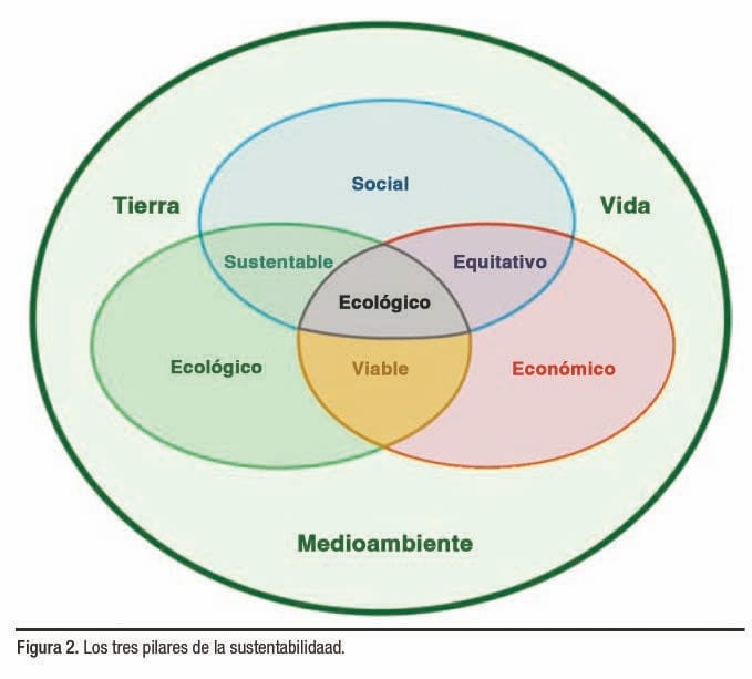 El renderizado también representa los tres pilares de la sostenibilidad: Medioambiental, Económico y Social. El concepto de sostenibilidad se ha debatido públicamente desde los años ochenta y los tres pilares se han presentado como una “visión común” del desarrollo sostenible en los medios de comunicación desde 2001 (Figura 2).