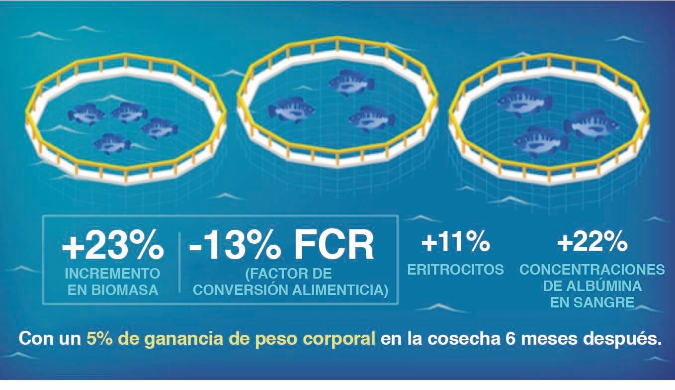 Los resultados mostraron una ganancia significativa de biomasa del 23% y un factor de conversión alimenticia (FCR, por sus siglas en inglés) con una reducción del 13% en comparación con el grupo control, así como un aumento de las concentraciones sanguíneas de eritrocitos y albúmina del 11% y el 22%, respectivamente, en el plazo de un mes postvacunación y/o el estrés por manipulación.