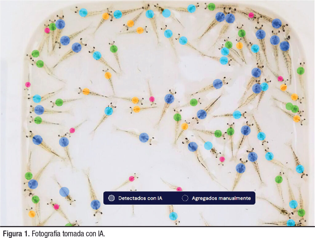 Se trató en lo posible de realizar muestreos paralelos a través de una App con inteligencia artificial (Figura 1), con la cual también se determinó el peso y longitud promedio, así como los respectivos coeficientes de variación de peso, coeficiente de variación de longitud, entre otros datos.