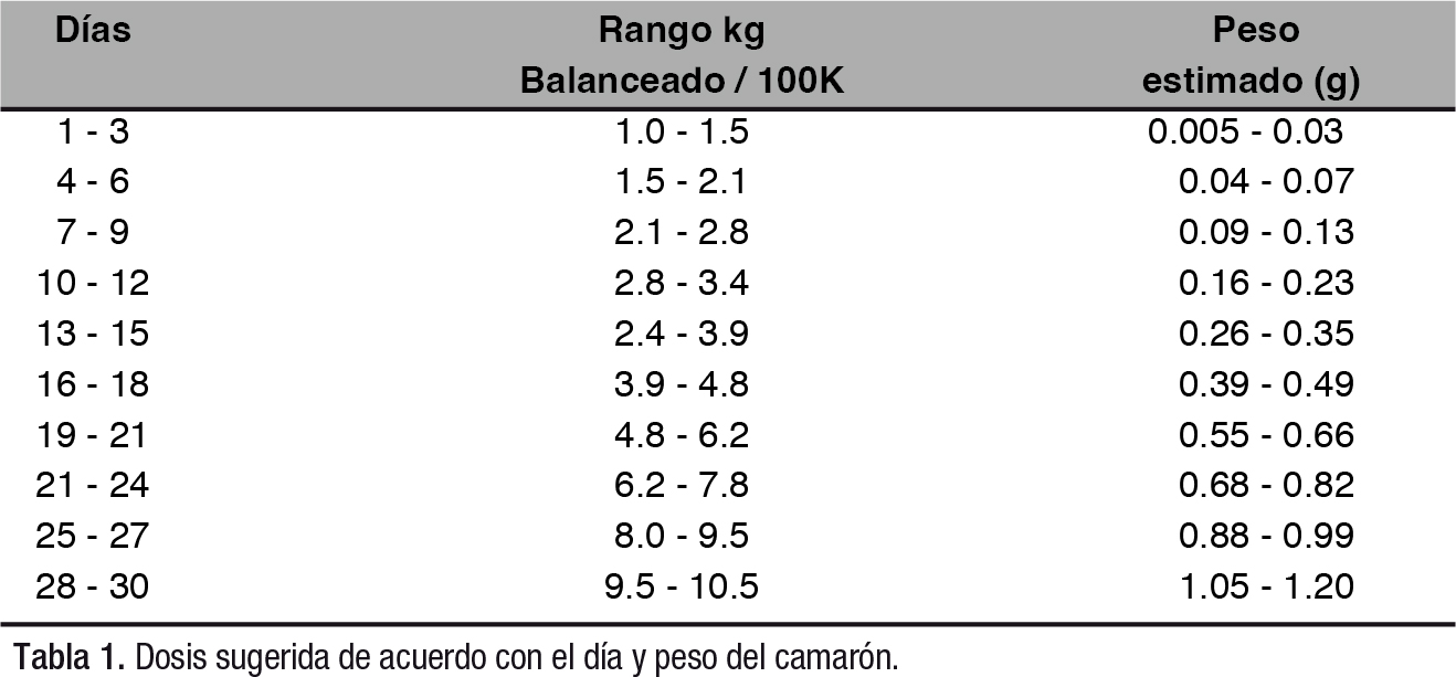 En este ciclo de pruebas la cantidad de alimento diario a suministrar se fijó en función del número de días y/o el peso promedio de las PL (Tabla 1); sin embargo, en una de las pruebas se utilizó la tabla de referencia que tenía la camaronera. Los tamaños de partículas y el porcentaje de proteína difirieron entre centros de producción.