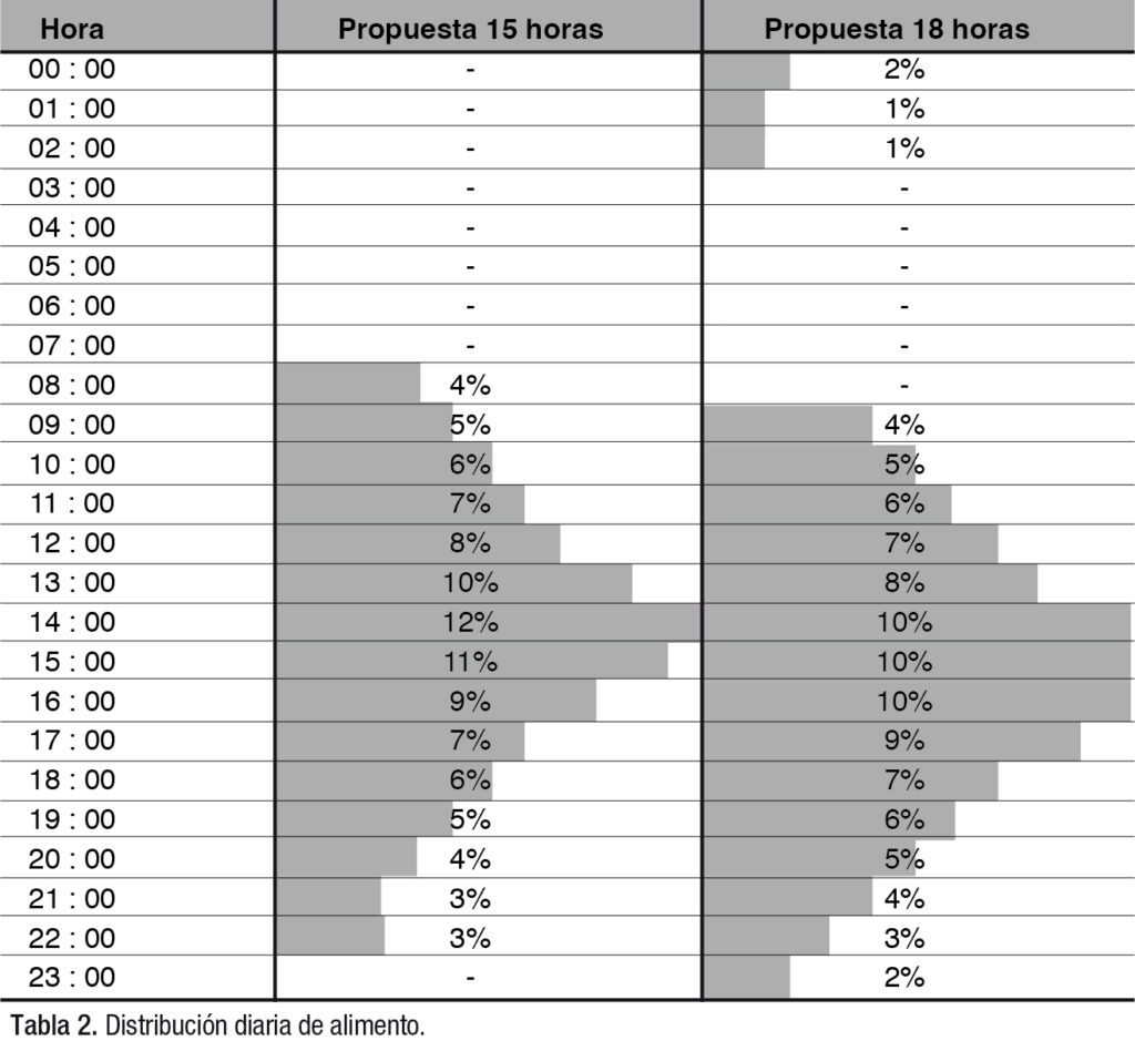 Durante la fase de voleo se alimentó entre 4 y 6 veces por día y, una vez que se pasaba a alimentación automática, se distribuía el alimento dentro de 15 a 18 horas por día cada 10 a 15 minutos y distribuida porcentualmente por hora, distribuyendo el mayor porcentaje de alimento durante las horas del día con mejor oxígeno y temperatura (Tabla 2).