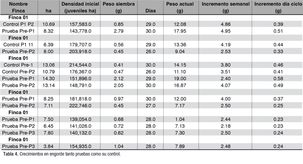 Para esta evaluación, se consideraron piscinas sembradas en fechas similares respecto a las que venían de las pruebas de precrías con alimentación automática, y se tomó como control una piscina sembrada con un manejo de precría tradicional, en todos los casos en la fase de engorda se alimentó con alimentadores automáticos conforme al protocolo de cada finca para esta etapa, la cual difería una de otra, logrando ingresar a la fase de alimentación acústica entre los 4 y 6 gramos de peso promedio.