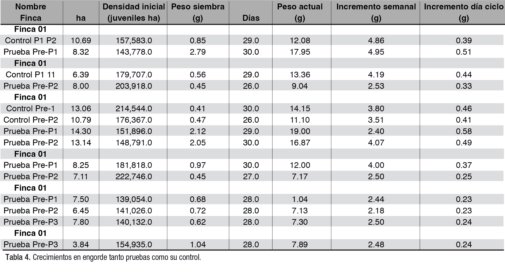 En dos de las fincas se usó alimento al 42% con tamaño de partícula 0.8, 1.0 y 1.2 mm de proteína; para este caso, se realizó la transición de partícula a los 0.03 gramos de 0.8 a 1.0 mm y a 1 gramo se pasó de 1.0 a 1.2 mm. Por otro lado, en dos fincas se emplearon únicamente dos tamaños de partículas (1.0 y 1.2 mm) en toda la fase de precría, donde la transición del tamaño de partícula se dio cuando los juveniles alcanzaron los 0.30 gramos.