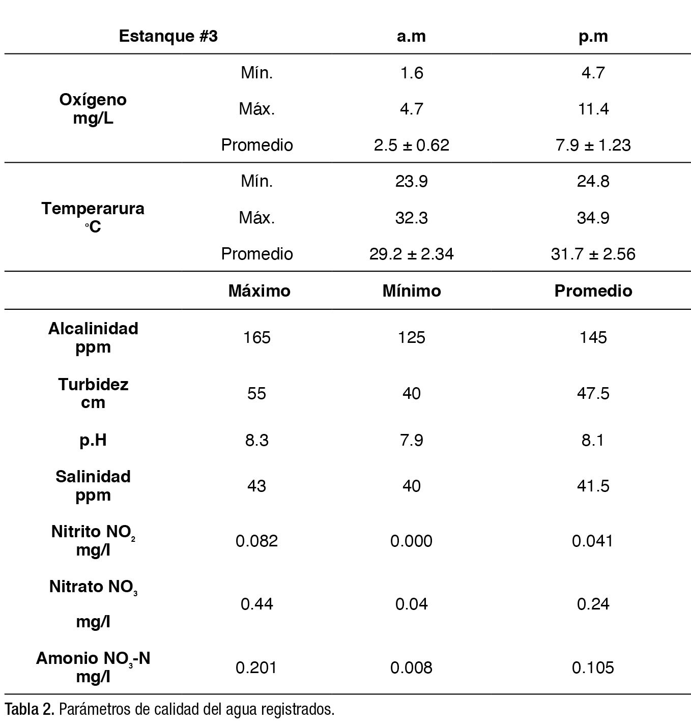 Los parámetros fisicoquímicos del agua se mantuvieron dentro de los valores aceptables para el desarrollo del camarón, a pesar de que se obtuvieron algunos valores atípicos, no representaron un riesgo que pudiese afectar a los organismos, considerados en un cultivo tradicional (Tabla 2).