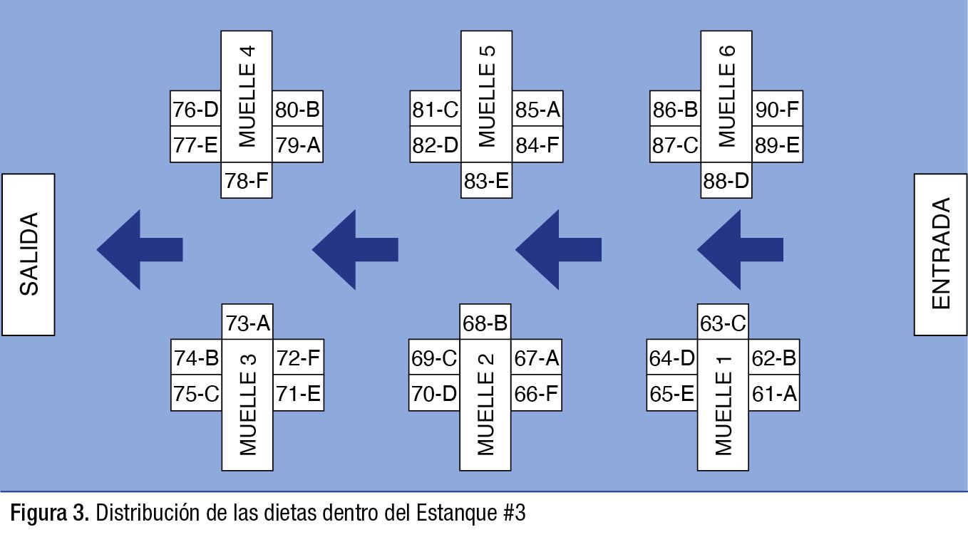 Todas las dietas fueron formuladas con alimento Api-camarón Dinamo 35/15, 35% proteína, para satisfacer los requerimientos nutricionales en la etapa de crecimiento. Durante la evaluación se consideraron seis (6) tratamientos (A-F) (Tabla 1), cada uno con cinco (5) réplicas distribuidas en seis (6) muelles (Figura 3).