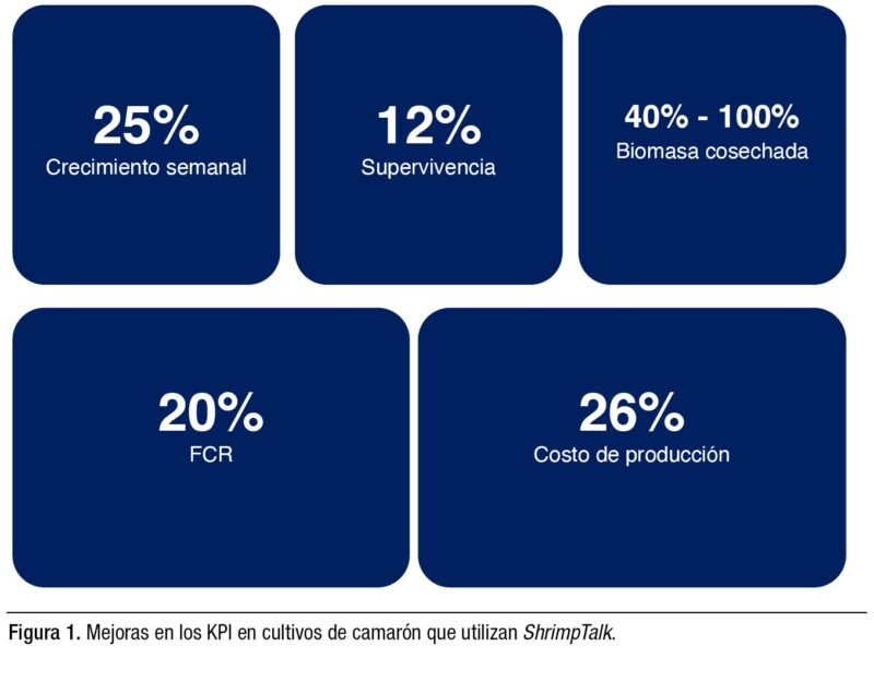 ShrimpTalk ya está causando sensación en más de 12 países. Los acuicultores que lo utilizan informan de las mejoras en los KPI de sus cultivos, entre los que destacan crecimiento semanal, supervivencia, biomasa cosechada, factor de conversión alimenticia (FCR, por sus siglas en inglés) y costo de producción (Figura 1).