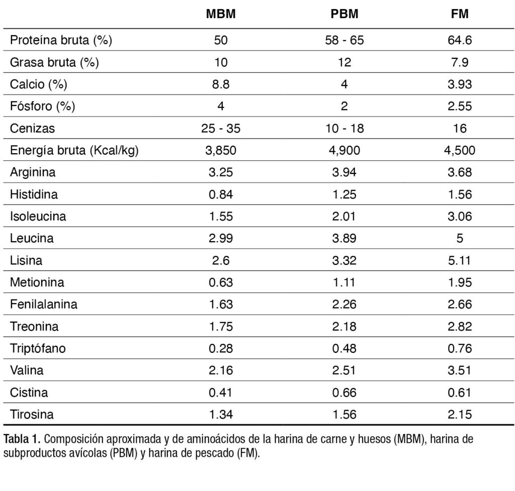 La PBM es similar a la FM en cuanto a su composición, salvo por un contenido ligeramente inferior de algunos aminoácidos. La MBM tiene un contenido algo menor de algunos aminoácidos y mayor de minerales, en comparación con la FM (Tabla 1). Se han descrito con frecuencia variaciones significativas en la composición de estas harinas proteicas, que podrían deberse en gran medida a la variabilidad en la composición y la calidad de la materia prima.