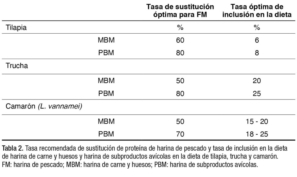 La tasa óptima de sustitución de FM y la tasa de inclusión dietética de MBM y PBM en las dietas de camarones, tilapias y truchas se indican en la Tabla 2. Estos valores se derivan principalmente de los resultados de ensayos de crecimiento. A tasas de sustitución elevadas, los nutricionistas de alimentos deben examinar el equilibrio de aminoácidos y considerar la suplementación con aminoácidos sintéticos si es necesario. Bajo la relación de precios normales entre FM, MBM y PBM, la sustitución de FM por MBM o PBM debería reducir de manera importante la demanda de FM y también el costo del alimento y el aumento de peso.