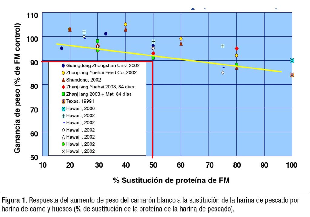 Cuando se representó en una gráfica la respuesta del aumento de peso en función de la tasa de inclusión real de FM, se observó que el camarón blanco puede crecer bastante bien con una tasa de inclusión de FM tan baja como del 10-20%, más una tasa de inclusión de MBM de aproximadamente el 20% en la dieta. Sin embargo, un alto nivel de sustitución de FM por MBM generalmente dio lugar a una pérdida de entre el 3% y el 5% en la eficiencia alimentaria. Los datos de la bibliografía indican que la sustitución de FM por MBM no tiene un efecto significativo sobre la mortalidad, la composición de la carcasa y las características gustativas.