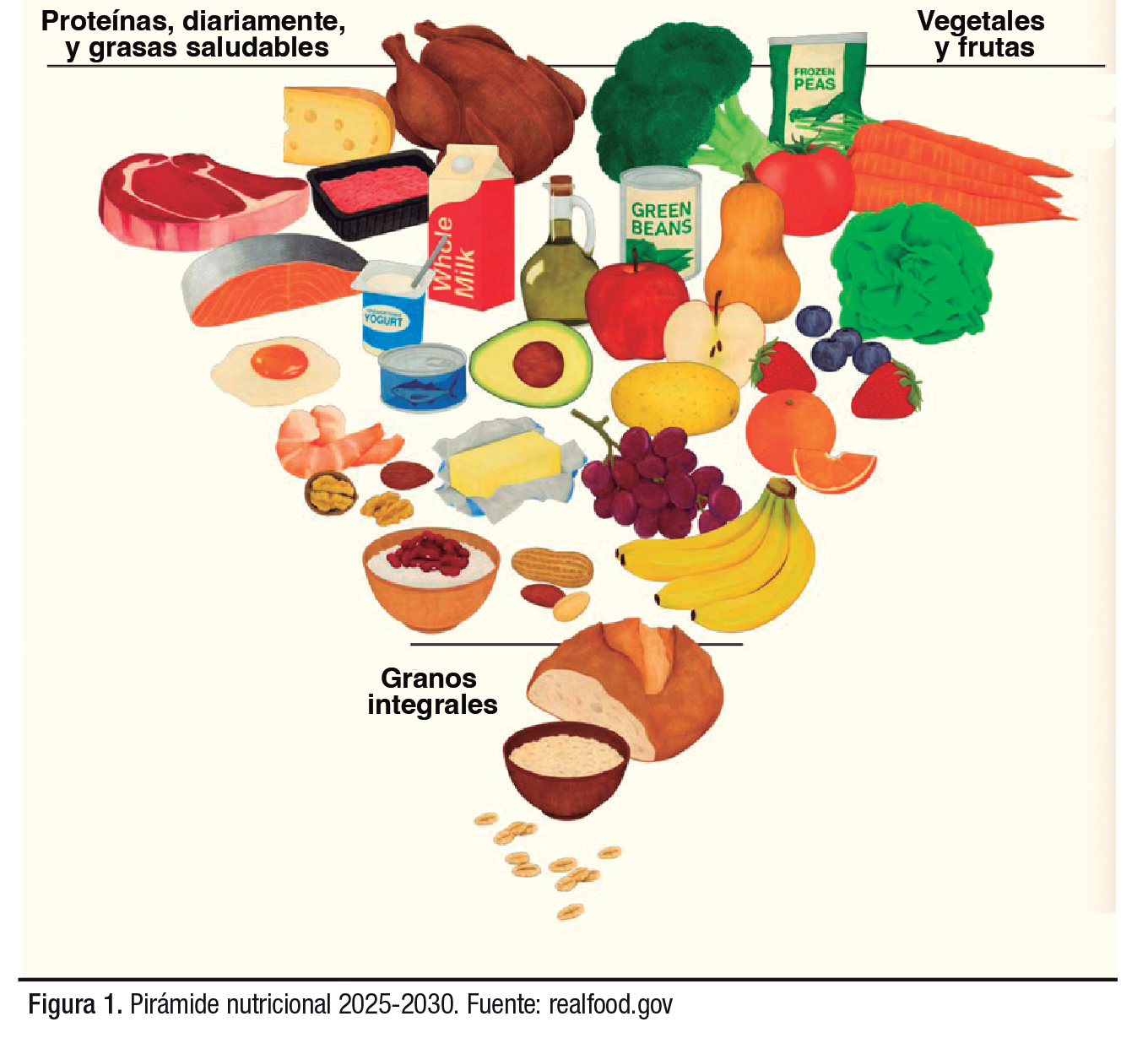 El 7 de enero de este año, el Departamento de Salud y Servicios Humanos de los Estados Unidos realizó una revisión profunda de las recomendaciones alimentarias: la pirámide nutricional 2025–2030 (Figura 1). El cambio es claro y directo, alejarse de los alimentos ultraprocesados (altos en azúcares, carbohidratos refinados, sodio, grasas saturadas y aditivos) y volver a priorizar alimentos reales. Ahora se pone el foco en proteínas de alta calidad, grasas saludables, frutas, verduras y granos integrales; en la práctica, la pirámide se invierte para destacar lo que realmente nutre.