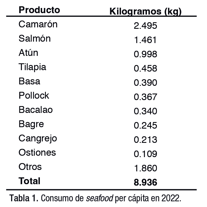 Los productos consumidos en los cuales podríamos ver un aumento en los Estados Unidos, debido a estos cambios nutricionales, son: camarón, salmón, atún y tilapia principalmente. El consumo de seafood per cápita se ha mantenido similar en las últimas dos décadas (Tabla 1), donde el camarón ha sido el producto preferido, desplazando al atún del primer lugar desde el año 2000. La tendencia de consumo deberá cambiar al sustituir otros alimentos por proteínas de alto valor.