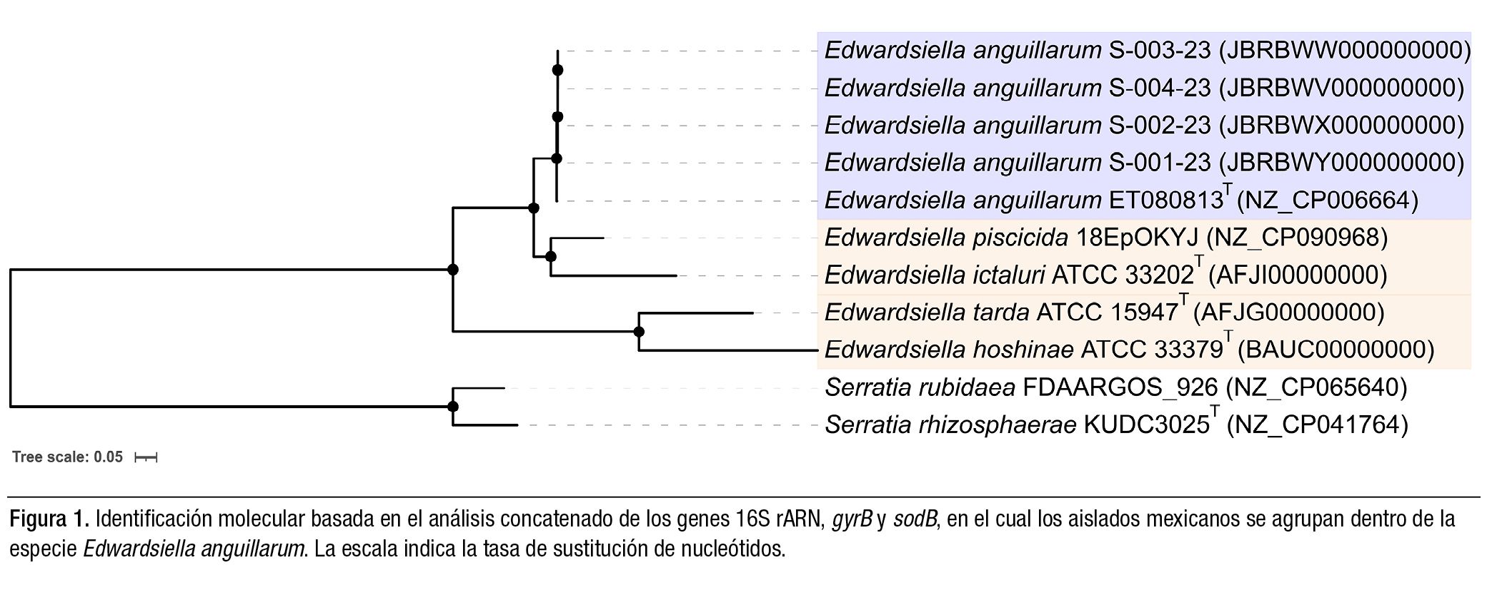La identificación preliminar mediante la secuenciación de los genes 16SrARN, gyrB y sodB mostró porcentajes de identidad del 99.86%, 99.95% y 100%, respectivamente, con la cepa tipo E. anguillarum ET080813T. El análisis filogenético de las secuencias concatenadas confirmó que los cuatro aislados mexicanos se agrupan dentro del clado de referencia de E. anguillarum ET080813T, con un soporte bootstrap del 100% (Figura 1).