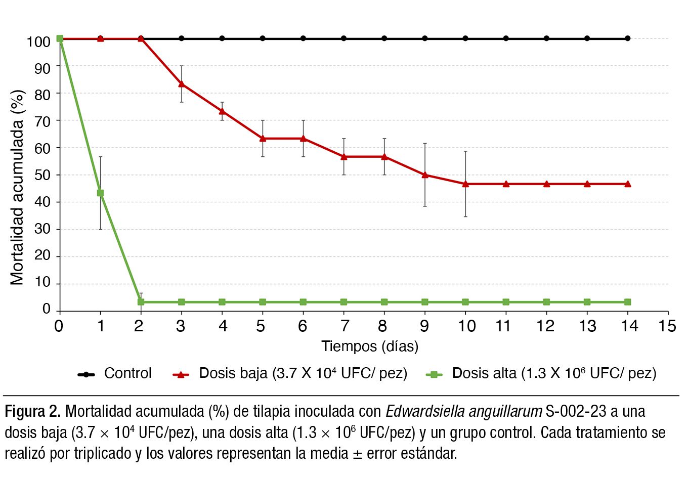 La patogenicidad se evaluó mediante infección experimental en tilapia. Debido a la alta homogeneidad genética observada entre los aislados, se seleccionó la cepa S-002-23 para el desafío. El aislado fue reactivado mediante pasaje en peces y, posteriormente, se inocularon tilapias sanas con dosis altas (1.3 × 106 UFC/pez) y bajas (3.7 × 104 UFC/ pez) de la bacteria, además de un grupo control. Cada tratamiento incluyó tres réplicas con 10 peces cada una.