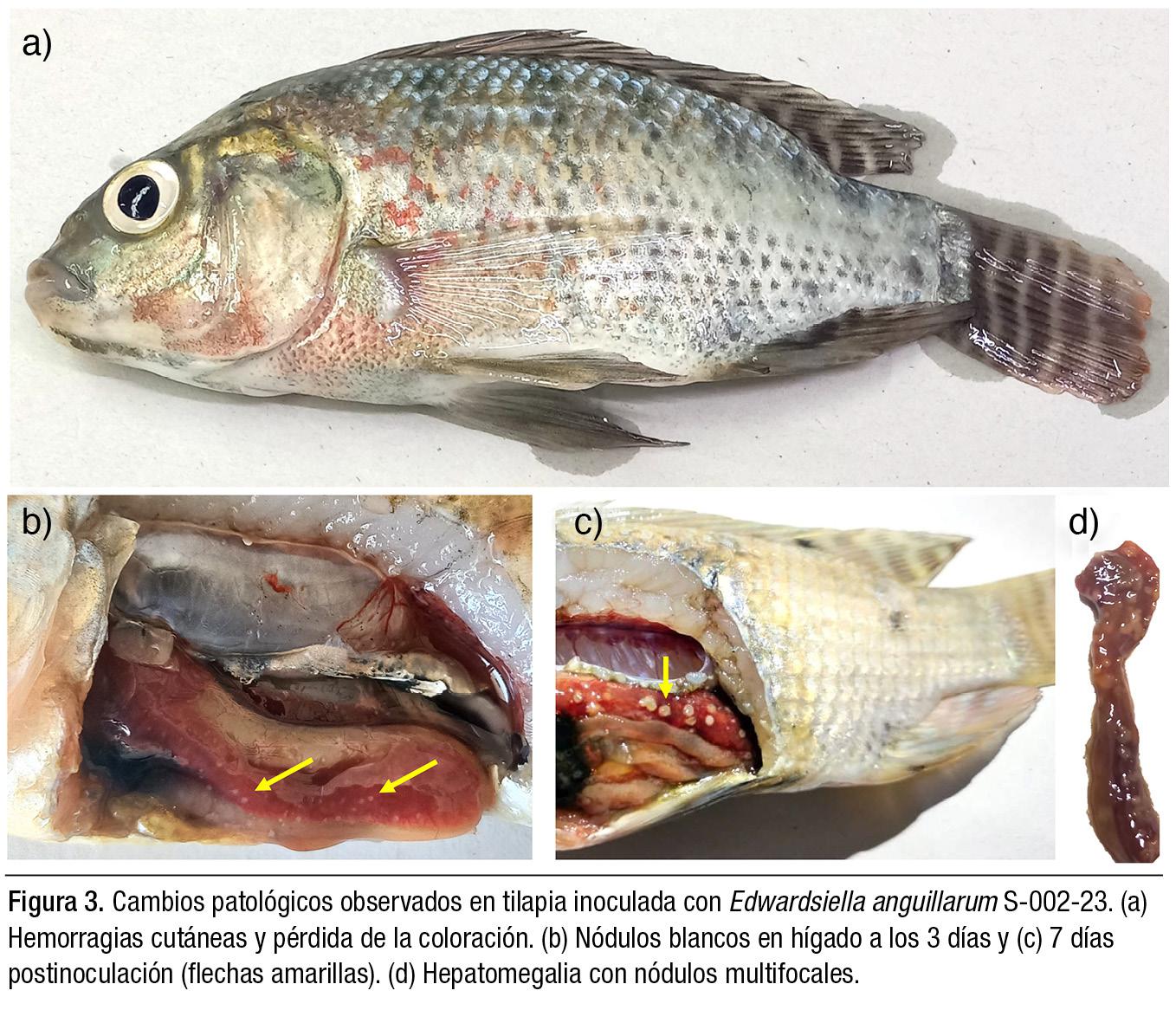 Finalmente, los peces infectados desarrollaron lesiones características de la edwardsiellosis, como hemorragias cutáneas, ascitis y granulomas en hígado y bazo, confirmando la consistencia clínica de la infección. Lesiones similares han sido descritas en brotes de E. anguillarum en tilapia en Costa Rica y Egipto (López-Porras et al., 2018; Armwood et al., 2019; Elgendy et al., 2022). Además, estudios recientes han documentado infiltración inflamatoria en el intestino de peces infectados, lo que podría explicar la acumulación de líquido intestinal observada en este estudio (Rahmawaty et al., 2024).